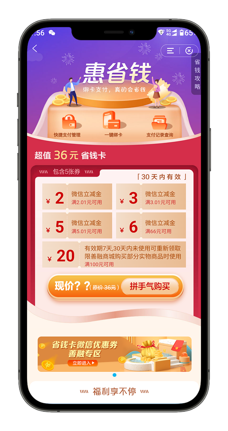 银行卡首绑有礼、收银台满减、银行立减金、银行行业券、全场代金券、微信红包等产品服务;